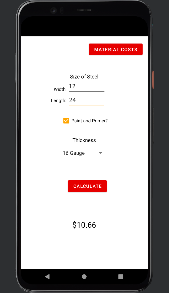 Spinnerwidgets for quick Gauge selection and Checkboxes for binary options (Paint/Primer), minimizing typing errors. - Real-Time Feedback: The “Calculate” action immediately processes the inputs against the saved configuration to display a clear dollar value.